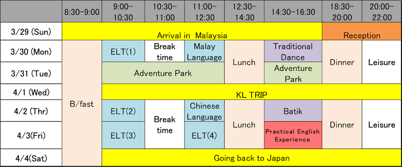 3月29日にキャンプインし、4月4日に帰国する6泊7日のメニューをご用意しています。英語中心のレッスンに加え、アドベンチャーパークでのアクティビティ中国語とマレー語に親しむためのレッスンマレーシア文化体験、そしてクアラルンプール日帰り遠足をプログラムに組み込んでいます。